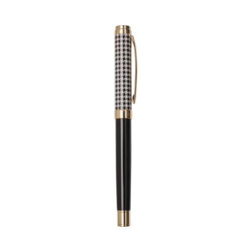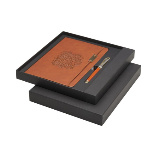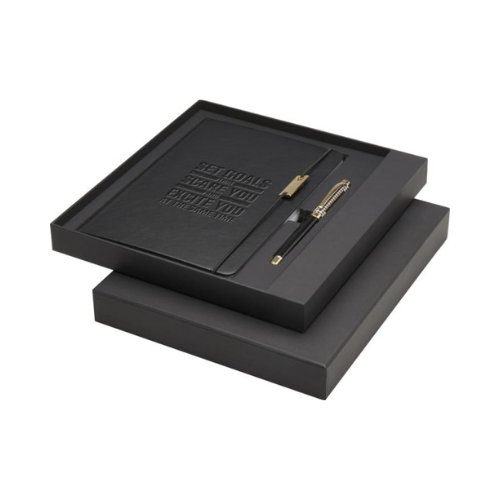 Cet ensemble associe élégamment un carnet A5 et un stylo roller. Le stylo dispose d’un corps en laiton recyclé avec finition chromée or, complété par une finition noire/marron, des accessoires en métal chromé or et le logo LUXE sur l’anneau central.