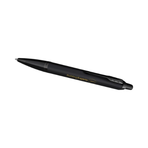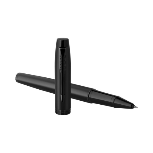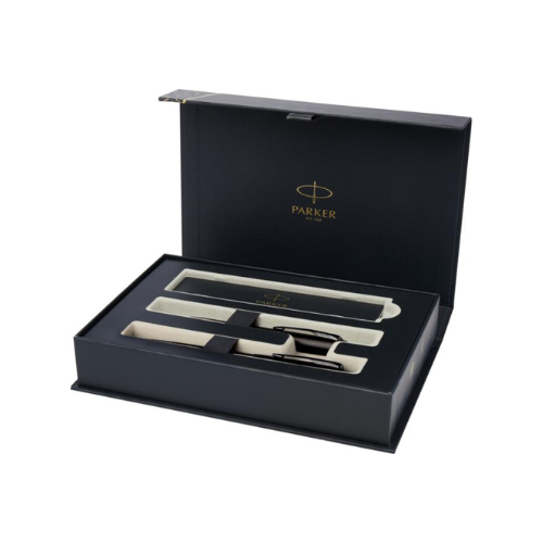 Parure Parker IM achromatique comprenant un stylo bille et un roller. Design contemporain, écriture fluide, présentée en coffret cadeau.