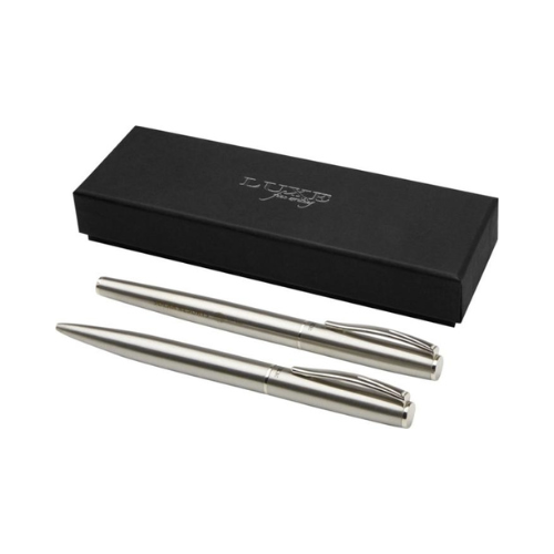 Cet ensemble composé d’un stylo bille et d’un stylo roller est fabriqué en acier inoxydable recyclé. Le choix de ce matériau durable contribue à la réduction des déchets tout en offrant un instrument d’écriture élégant, robuste et respectueux de l’environnement.
