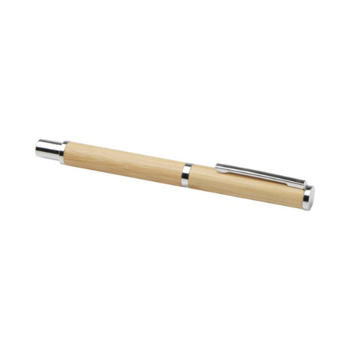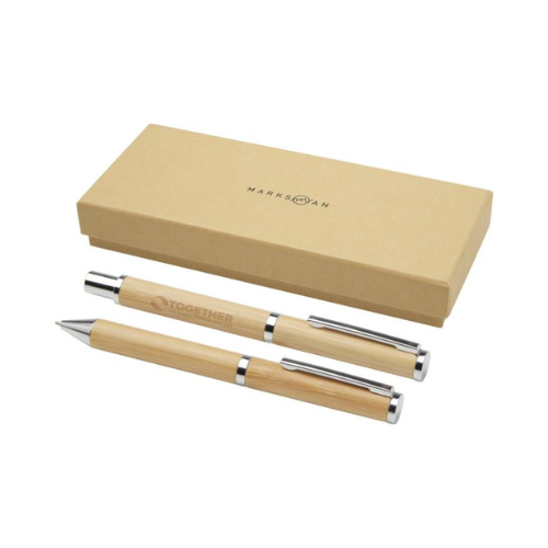 Coffret cadeau comprenant un stylo bille et un stylo roller en bambou, avec des éléments en laiton recyclé à finition chromée brillante. Une parure élégante et plus durable, conçue à partir de matériaux renouvelables et recyclés.