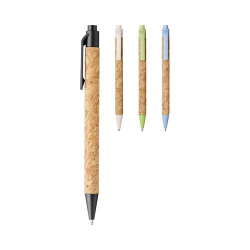 Stylo à bille écologique rétractable avec corps en liège naturel et finitions en paille de blé de différentes couleurs, une alternative plus écologique réduisant l’utilisation de plastique. La teinte du liège peut légèrement varier.